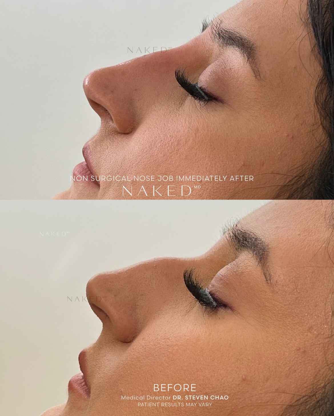 Ideal for people who are looking to smooth out bumps on their nose, enhance their bridge, lift or add structure to the tip. Although a NSNJ may change the appearance anteriorly, it mainly affects the lateral or “side” profile. When filler is placed properly, it may give the illusion of a smaller and thinner nose. A NSNJ does not remove volume from the nose or shorten it.